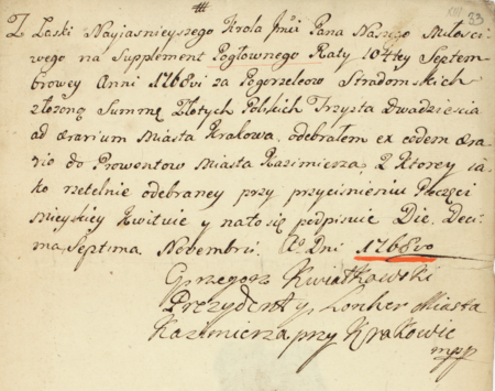 Z księgi rachunkowej miasta Kazimierza obejmującej dochody i wydatki w latach 1582–1791: pokwitowanie finansowe z roku 1768 podpisane przez ówczesnego burmistrza i lonera Grzegorza Kwiatkowskiego – oraz zbliżenie podpisu (Archiwum Narodowe w Krakowie, sygn. K 695, s. 33)