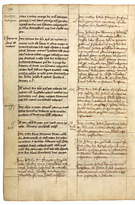 Z „Najstarszej księgi” strona 76 z wpisem z 1327 roku w sprawie przeniesienia przez Heinemana praw do połowy składu sukna na swego siostrzeńca Teodora – oraz powiększenie zapisu imienia (Archiwum Państwowe w Krakowie, sygn. rkps 1, s. 76)