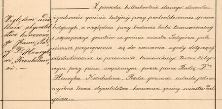 …z powodu kilkakrotnie danego dowodu życzliwości gminie tutejszej przy pertraktowaniu spraw kolejowych… (z uchwały Rady Gminnej – ANK, sygn. 29/53/7, s. 70) |