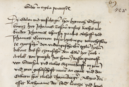 Z księgi radzieckiej obejmującej lata 1450–1483 fragment strony 425 z wpisem z 1469 roku dotyczącym rozsądzenia przez rajców Jana Teschnera (nr 257) i Henryka Schrepkowicza, przy współudziale mieszczan Jana Turzona (nr 285), Pawła Althofa i Jana Gawrona (nr 281), sporu finansowego między dwoma spółkami kupieckimi – oraz powiększenie zapisu imienia (Archiwum Państwowe w Krakowie, sygn. rkps 429, s. 425)