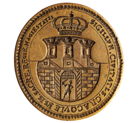 (015) Stempel (zwierciadlane odbicie) herbowej pieczęci większej miasta sporządzonej w 1661 r. – pieczęć została ufundowana przez rajcę Krzysztofa Krauza. Widnieje na niej herb usankcjonowany jako urzędowe godło miasta: na renesansowej tarczy mur miejski ceglany z trzema basztami z otworami strzelniczymi i blankami na szczytach, brama muru otwarta, z nieco opuszczoną kratownicą, podwoje rozchylone, widoczne ich okucia, w bramie orzeł z rozpostartymi skrzydłami i koroną, na górnej krawędzi tarczy herbowej wsparta korona królewska zamknięta z krzyżykiem na szczycie. Ten opis jednocześnie w pełni odpowiada opisowi... herbu Krakowa obowiązującemu dzisiaj. Zatem nasz obecny herb miasta bezpośrednio koresponduje z tym ustalonym prawie 360 lat temu! Oddaje to wagę rozwiązań przyjętych w 1661 r., które z kolei nie były rozwiązaniami rewolucyjnymi w tym zakresie, lecz wynikiem ewolucji trwającej od XIV stulecia, z korzeniami sięgającymi wieku XIII, ściślej czasów polokacyjnych miasta. Dziś mija zatem prawie 360 lat utrwalenia się wzoru herbu naszego miasta, 650 od pierwszej zachowanej pisemnej informacji o nim oraz prawie 740 lat od powstania pieczętnego prawzorca herbu (ANK, sygn. T 276)