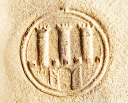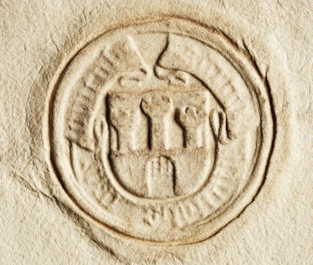 • Pod koniec XVI w. wprowadzono pieczęć miejską (pierwszy znany odcisk pochodzi z 1606 r.) z herbem, któremu przydano dla podkreślenia stołeczności miasta berło i miecz (zob. il. 013). Tych dodatkowych symboli później już nie podtrzymano, ale przyjął się na trwałe nowy, charakterystyczny, renesansowy kształt tarczy herbowej.