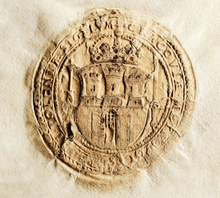 • W roku 1590 na herbie sygnetowym burmistrza pojawił się orzeł w otwartej bramie miejskiej (prawdopodobnie z koroną, ale ze względu na mały rozmiar obiektu trudno stwierdzić to jednoznacznie), a tarcza herbowa została nakryta królewską koroną (zob. il. 011) – były to nowe elementy wprowadzone do urzędowej pieczęci, ale jeszcze nie jako reguła.