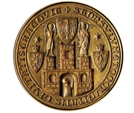 Wprawdzie nie znamy okoliczności powstania „pierwszego” herbu naszego miasta, ale znamy kształt jego prawzoru. Tym prawzorem była pieczęć miasta i wójta Krakowa postała w przedziale lat 1281– 1283, następnie – po obniżeniu rangi wójtostwa w wyniku buntu wójta Alberta – już w roku 1312 lub niewiele później przekształcona (przez zmianę napisu w otoku) w pieczęć miasta i rady miejskiej. Istotną składową będzie też rysunek muru miejskiego z trzema wieżami i otwartą bramą. To jeszcze nie jest herb Krakowa, jego epoka jeszcze nie nadeszła, ale jest to już uwieczniony na pieczęciach przekaz mający symbolizować Kraków, rozbudowane różnymi wyobrażeniami godło, które z czasem – zachowując właśnie mur miejski z wieżami – da początek herbowi miasta (zob. il. 001–002).