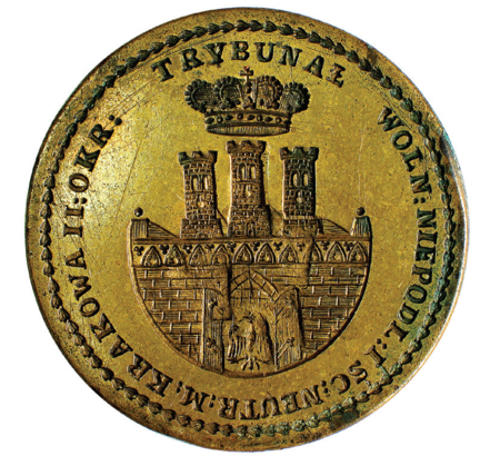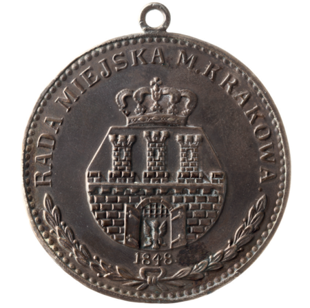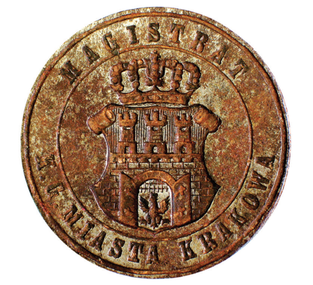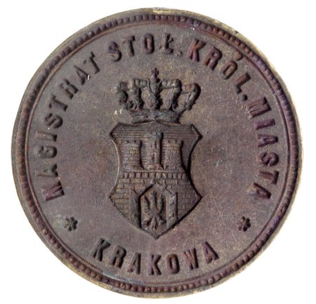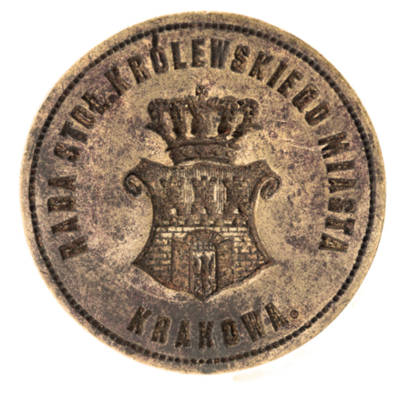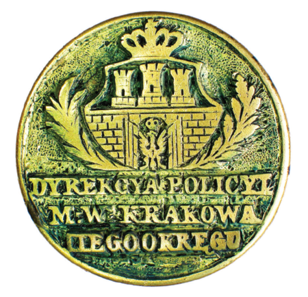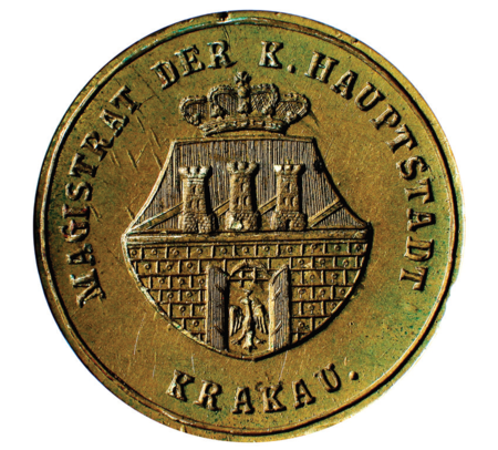 Upadek Wolnego Miasta Krakowa w 1846 r. skutkował włączeniem miasta do granic cesarstwa austriackiego – rozpoczęła się druga faza zaboru, tym razem dłuższa, trwająca aż do odzyskania niepodległości przez państwo polskie w roku 1918. W 1848 r. władze austriackie powołały tymczasową Radę Miejską – zachowała się jej herbowa odznaka noszona na szyi przez ówczesnych radców miejskich (zob. il. 022). W roku 1853 w wyniku nasilenia autorytarnych tendencji w cesarstwie rozwiązano tę Radę, a jej funkcje przejął Magistrat Miasta Krakowa. Z tego czasu zachowała się herbowa pieczęć magistracka z napisem w otoku w języku niemieckim i dzięki temu możemy poznać kształt obowiązującego wówczas herbu (zob. il. 023). Okazuje się, że po 1846 r. utrzymano specyficzne dla okresu Wolnego Miasta Krakowa proporcje między murem miejskim a wieżami oraz charakterystyczną dla tamtego okresu linię obrysu tarczy herbowej.