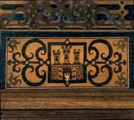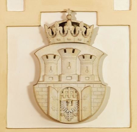 W tym też czasie na pięknych drzwiach do Izby Pańskiej w Ratuszu na Rynku, datowanych na rok 1593, pojawił się herb miasta z orłem w bramie (zob. il. 012) – była to główna sala ratuszowa, tam zasiadali rajcy miejscy, decydujący m.in. także o kształcie herbu. Można by się zatem spodziewać, że wprowadzono wtedy jego nowy wzór: z orłem i koroną królewską. Tak się jednak jeszcze nie stało i herb wciąż się nie ustabilizował, a w oficjalnym obiegu (co widać na pieczęciach miejskich) funkcjonowały różne jego wzory: dawne bez orła i korony nad tarczą oraz nowe z orłem w bramie albo z tarczą korony królewskiej lub też z oboma elementami równocześnie. Na dodatek z końcem XVI w. wprowadzano inne jeszcze „udostojnienie” herbu. Otóż do wersji niemającej orła w bramie, natomiast z koroną nad tarczą, wprowadzono po bokach tarczy w pionowym układzie z jednej strony berło, a z drugiej miecz – symbole te miały podkreślać stołeczność Krakowa. Tak wzbogacony herb nie przetrwał wówczas próby czasu, ale i nie zaginął zupełnie bez śladu: łatwo dostrzec, że jest to kształt co do zasady zbieżny z obowiązującym w naszych czasach. To on jest pierwowzorem dzisiejszej tarczy herbu Krakowa (zob. il. 013).