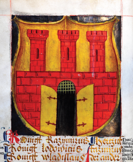 (009) Herb Krakowa z Kodeksu Behema, zbioru praw i przywilejów Krakowa, powstałego przed rokiem 1505 na zamówienie ówczesnej rady miejskiej; ułożył go Baltazar Behem, notariusz miejski. Herb tu zamieszczony wyprzedził swą epokę – jest wyrazem tendencji w kierunku „udostojnienia” herbu, do tej pory pozbawionego akcentów symbolizujących stołeczność i królewskość miasta (BJ, sygn. rkps 16, k. 4v)