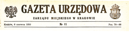 (031) Winiety „Gazety Urzędowej” (oficjalnego publikatora miejskich przepisów) z roku 1950. Wzór wprowadzony w latach 30. XX w. przyjęto także w latach 1945–1950, dodając jednak obok herbu miasta (też zresztą według wzoru herbu przedwojennego) godło państwowe. Po wejściu w życie 14 kwietnia 1950 r. ustawy o terenowych organach jednolitej władzy państwowej znoszącej instytucje samorządowe, już w czerwcu tegoż roku herb miasta wycofano z winiety „Gazety Urzędowej” – a było to ostatnie miejsce, w jakim widniał oficjalnie. W miejsce dotychczasowego Zarządu Miejskiego wprowadzono Prezydium Miejskiej Rady Narodowej, jako organ administracji państwowej, a nie samorządu, co sprawiło, że miejsce herbu jako oficjalnego symbolu zajęło godło państwowe (z zasobów UMK)Po wyborach 4 czerwca 1989 r. i przełomie ustrojowym odrodzony w roku 1990 samorząd krakowski bez większej zwłoki zajął się kwestią herbu miasta. Podstawą była tu Ustawa z 8 marca 1990 r. o samorządzie terytorialnym, która w art. 18 ustaliła wyłączną właściwość rady gminy w kwestii herbu gminy. Liczne nowelizacje tej ustawy w odniesieniu do herbu gminy niczego nie zmieniły.