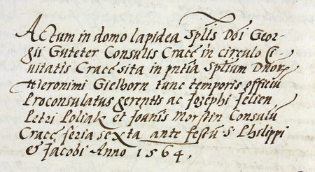 Z księgi radzieckiej obejmującej lata 1561–1567 fragment strony 488 z początkiem wpisu z 1564 roku, stwierdzającego, że w piątek przed świętem św. św. Filipa i Jakuba w domu murowanym należacym do rajcy Jerzego Gutterera (nr 368) rajcy: Hieronim Gielhorn, wówczas burmistrz, Józef Jeleń (nr 377), Piotr Polak (nr 384) oraz Jan Morsztyn (nr 385), przyjęli zeznanie testamentowe Jerzego Guttetera – oraz powiększenie zapisu imienia i funkcji burmistrza (Archiwum Państwowe w Krakowie, sygn. rkps 445, s. 488)