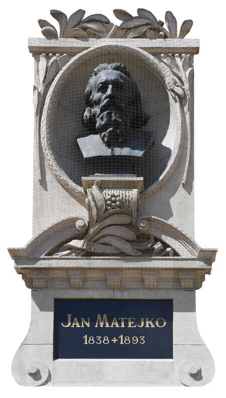 Z prawej strony popiersie Jana Matejki, honorowego obywatela Krakowa z 1882 r., znajdujące się na wschodniej elewacji budynku Pałacu Sztuki – Towarzystwa Przyjaciół Sztuk Pięknych w Krakowie; dzieło Antoniego Madeyskiego odsłonięte w 1901 r. Z lewej strony tablica upamiętniająca Jana Matejkę, odsłonięta na budynku Akademii Sztuk Pięknych w Krakowie w 1938 r., w 100. rocznicę urodzin mistrza.