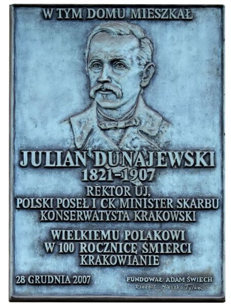 Tablica poświęcona Julianowi Dunajewskiemu, honorowemu obywatelowi Krakowa z 1887 r., dłuta Mieszka Tylka, wmurowana w 2007 r. w budynek przy ul. Dunajewskiego. W inskrypcji m.in.: REKTOR UJ, / POLSKI POSEŁ I CK MINISTER SKARBU / KONSERWATYSTA KRAKOWSKI / WIELKIEMU POLAKOWI / W 100 ROCZNICĘ ŚMIERCI / KRAKOWIANIE. |