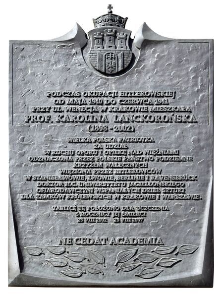 Tablica upamiętniająca Karolinę Lanckorońską, laureatkę srebrnego medalu „Cracoviae Merenti” z 1995 r., wmurowana w 2007 r. w 5. rocznicę zgonu w fasadę kamienicy przy ul. Wenecja, gdzie Karolina Lanckorońska mieszkała w czasie okupacji niemieckiej. Z inskrypcji: WIELKA POLSKA PATRIOTKA / ZA UDZIAŁ / W RUCHU OPORU I OPIEKĘ NAD WIĘŹNIAMI / ODZNA- CZONA PRZEZ POLSKIE PAŃSTWO PODZIEMNE / KRZYŻEM WALECZNYCH / WIĘZIONA PRZEZ HITLEROWCÓW / W STA- NISŁAWOWIE, LWOWIE, BERLINIE I RAVENSBRÜCK / DOKTOR H.C. UNIWERSYTETU JAGIELLOŃSKIEGO / OFIARODAWCZYNI WSPANIAŁYCH DZIEŁ SZTUKI / DLA ZAMKÓW KRÓLEWSKICH W KRAKOWIE I WARSZAWIE. |