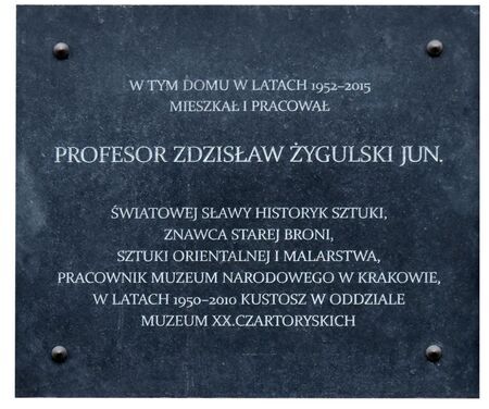 Zdzisława Żygulskiego jun., laureata brązowego medalu „Cracoviae Merenti” w 2007 r. – z kamienicy przy ul. Dunin-Wąsowicza, odsłonięta w 2017 r. |
