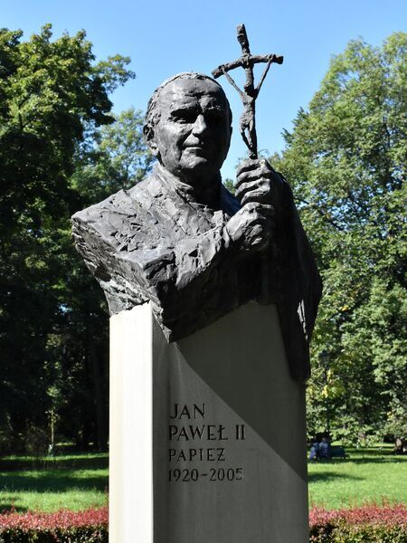 Pomnik papieża Jana Pawła II, laureata złotego medalu „Cracoviae Merenti” w roku 1993, dzieło włoskiej rzeźbiarki Jole Sensi Croci – dar artystów włoskich dla Krakowa; odsłonięty w 1980 r. jako pierwszy pomnik Jana Pawła II w Polsce, zlokalizowany na dziedzińcu Pałacu Biskupiego przy ul. Franciszkańskiej. |