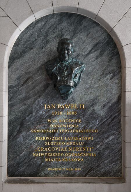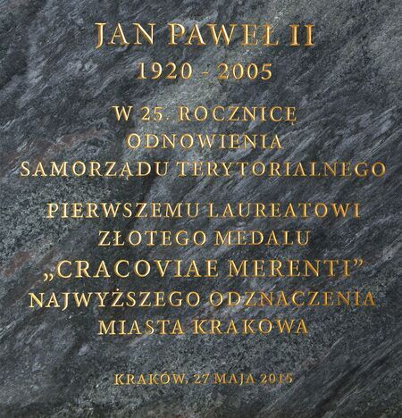 Płyta pamiątkowa z popiersiem dłuta Karola Badyny poświęcona papieżowi Janowi Pawłowi II, ufundowana przez samorząd miasta, wmurowana w 2015 r. w holu Kamiennym Pałacu Wielopolskich, siedziby władz miejskich, z okazji 25. rocznicy odnowienia samorządu krakowskiego, dedykowana Janowi Pawłowi II jako otwierającemu poczet laureatów medalu „Cracoviae Merenti”; na pierścieniu okalającym dolną część płaskorzeźby napis: CRACOVIAE MERENTI. |