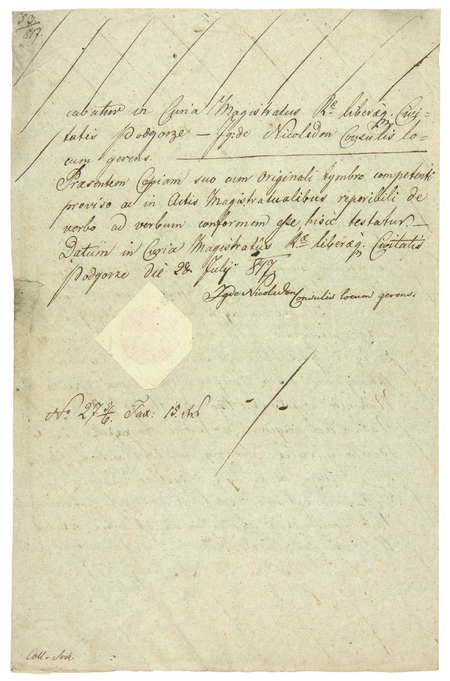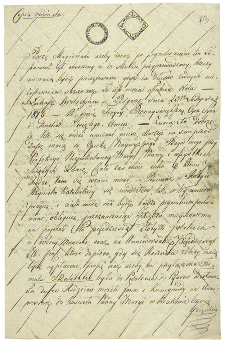 Z Tek Schneidera: zbliżenie podpisu Ignacego Nikoledona oraz pieczęci miejskiej z dokumentu z 1823 roku stanowiącego układ pomiędzy Podgórzem a Marcinem Abrahamowiczem w sprawie rozliczeń należności względem miasta (Archiwum Narodowe w Krakowie, sygn. T.Schn. 1253, s. 237)Z akt spadkowych Podgórza obejmujących lata 1793–1854: kopia pierwszej i ostatniej strony testamentu Łukasza Kretschmera, intendenta policji w Podgórzu, sporządzona i uwierzytelniona w 1817 roku przez Ignacego Nikoledona, ówczesnego podsędka i notariusza podgórskiego – oraz zbliżenie zapisu imienia i pieczęci opłatkowej miasta Podgórza (Archiwum Narodowe w Krakowie, sygn. P 279, s. 73, 76)