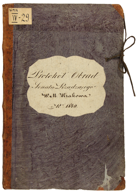 Z księgi protokołów obrad Senatu Rządzącego Wolnego Miasta Krakowa w 1840 roku przód oprawy i strona 162 z początkiem protokołu obrad z 28 października tegoż roku prowadzonych pod prezydencją Jacka Księżarskiego – oraz powiększenie zapisu imienia i funkcji (Archiwum Państwowe w Krakowie, sygn. WMK IV-29, s. 162)