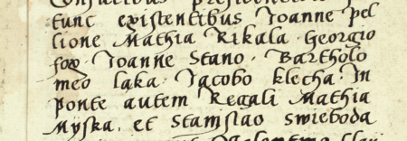 Z księgi radzieckiej Kazimierza obejmującej lata 1540–1545: fragment wpisu dokumentującego wybór rady urzędującej na rok 1540, z Jakubem Klechą w składzie – oraz zbliżenie zapisu imienia (Archiwum Narodowe w Krakowie, sygn. K 10, s. 1)