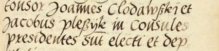 Z księgi radzieckiej Kleparza obejmującej lata 1539–1546: wpis z 1545 roku dokumentujący wybór rady urzędującej, z rajcą-burmistrzem Jakubem Pleszykiem w składzie – oraz zbliżenie zapisu imienia (Archiwum Narodowe w Krakowie, sygn. KL 24, s. 617)