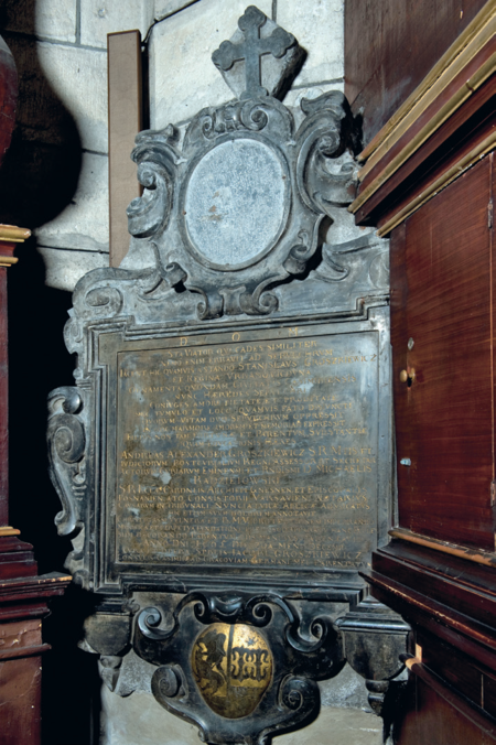 Epitafium z czarnego marmuru wystawione w roku 1695 w kościele Bożego Ciała przez rajcę Jakuba Stanisława Groszkiewicza swoim bliskim: Stanisławowi Groszkiewiczowi, Reginie Urbanowicównie i Andrzejowi Aleksandrowi Groszkiewiczowi – oraz zbliżenie herbu Samson i fragmentu tekstu upamiętniającego fundatora