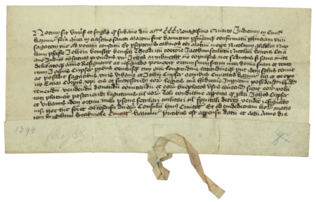 Dokument wydany w 1394 roku w Kazimierzu przez ławę miejską, w którym ławnicy kazimierscy stwierdzili, że Jan Armknecht odstąpił ogród koło kościoła Bożego Ciała Urbanowi i Janowi Czipserom – oraz zbliżenie zapisu imienia (Archiwum Narodowe w Krakowie, sygn. perg. 101)