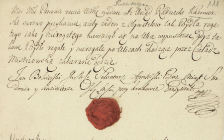 Z pism urzędu radzieckiego Kazimierza do mieszkańców Kazimierza z lat 1611–1787: niedatowane obwieszczenie podpisane przez burmistrza Jana Bekierskiego w sprawie zakazu wypuszczania na ulice bydła rogatego i nierogatego – oraz zbliżenie pieczęci radzieckiej pochodzącej z 1775 roku i zapisu imienia z funkcją (Archiwum Narodowe w Krakowie, sygn. 346, s. 111)
