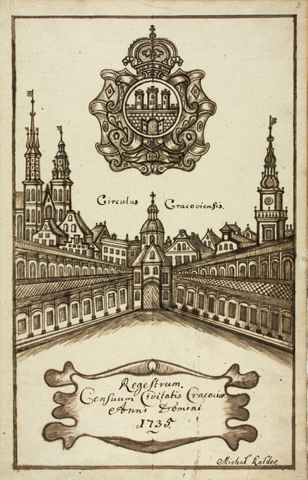 Z księgi czynszów miejskich obejmującej rok 1735 strona 3 (tytułowa) z rysunkiem piórkiem autorstwa Michała Kałdera oraz strony 130–131 z zestawieniem czynszów za rok 1735 wraz z podpisami rajców zatwierdzających rozliczenie, wśród których znajduje się Jan Feliks Baier – oraz powiększenie jego podpisu z podaniem urzędu rajcy (Archiwum Państwowe w Krakowie, sygn. rkps 1919, s. 3, 130–131)