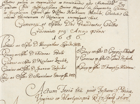 Z księgi radzieckiej obejmującej lata 1684–1688 fragment strony 705 zawierający wykaz rajców urzędujących wybranych na rok 1686, wśród których znajduje się Jan Franciszek Maderni – oraz powiększenie zapisu imienia (Archiwum Państwowe w Krakowie, sygn. rkps 470, s. 705)