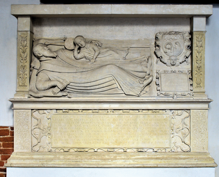 Pomnik nagrobny Jana Grota i jego synka w krużganku klasztoru oo. Dominikanów, wybudowany w drugiej połowie XVI wieku, oraz zbliżenie głowy Jana Grota i kartusza z herbem
