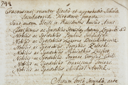 Z księgi radzieckiej obejmującej lata 1729–1736 fragment strony 744 z wykazem rajców urzędujących nominowanych na rok 1732, wśród których znajduje się Jan Jerzy Karli – oraz powiększenie zapisu imienia (Archiwum Państwowe w Krakowie, sygn. rkps 477, s. 744)