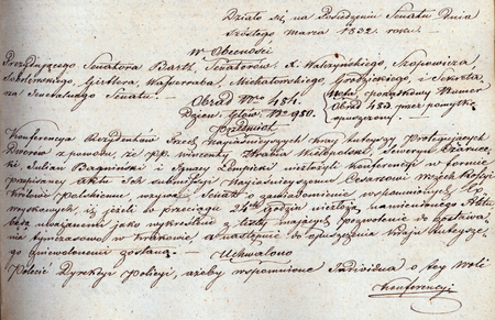 Z księgi protokołów obrad Senatu Rządzącego Wolnego Miasta Krakowa z 1832 roku fragment strony 111 z początkiem protokołu obrad prowadzonych 6 marca pod prezydencją Jana Bartla – oraz powiększenie zapisu imienia i funkcji (Archiwum Państwowe w Krakowie, sygn. WMK IV-19, s. 111)