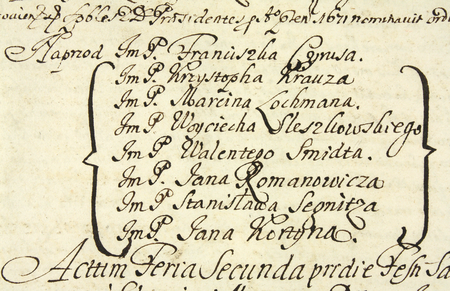 Z księgi radzieckiej obejmującej lata 1671–1675 fragment strony 6 z wykazem rajców urzędujących nominowanych na rok 1671, wśród których znajduje się Jan Kortyn – oraz powiększenie zapisu imienia (Archiwum Państwowe w Krakowie, sygn. rkps 467, s. 6)