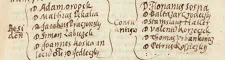 Z księgi radzieckiej Kleparza obejmującej lata 1573–1578: fragment wpisu z 1578 roku dokumentującego wybór rady urzędującej, z rajcą-burmistrzem Janem Koską w składzie – oraz zbliżenie zapisu imienia (Archiwum Narodowe w Krakowie, sygn. KL 28, s. 865)