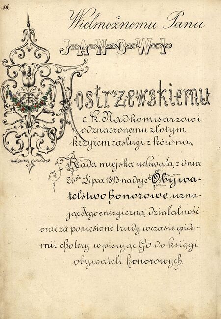 …uznając Jego energiczną działalność oraz za poniesione trudy w czasie epidemii cholery… (z wpisu do Złotej księgi – ANK, sygn. 29/53/33, s. 16) |
