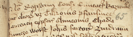 Z księgi radzieckiej Kazimierza obejmującej lata 1391–1402: fragment wpisu dokumentującego wybór rajców na rok 1392, z Janem krawcem w składzie – oraz zbliżenie zapisu imienia (Archiwum Narodowe w Krakowie, sygn. K 4, s. 65)