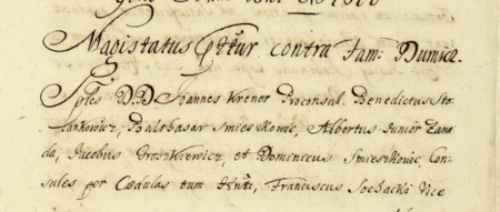 Z księgi radzieckiej Kazimierza obejmującej lata 1676–1684: początkowy fragment wpisu z 1676 roku dotyczącego sporu między radą miejską a Jakubem Duniczem (nr 322); wymieniono reprezentantów rady z Janem Krenerem jako burmistrzem na czele – oraz zbliżenie zapisu imienia i funkcji (Archiwum Narodowe w Krakowie, sygn. K 45, s. 100)