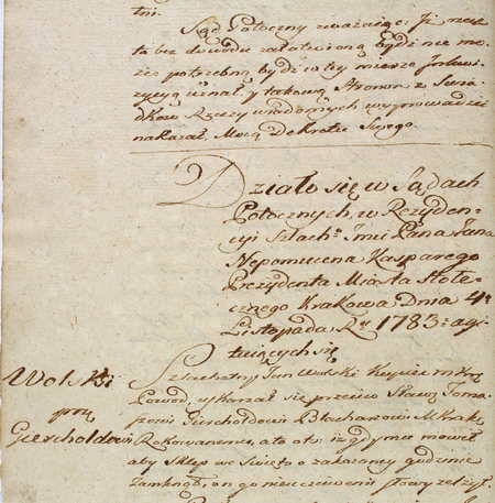 Z księgi miejskiej obejmującej protokoły sądów potocznych odbywających się w rezydencji prezydentów Krakowa w latach 1783–1784 fragment strony 118 z wpisem sprawy rozpatrywanej w 1783 roku za kadencji burmistrza (tu zwanego prezydentem) Jana Nepomucena Kaspariego – oraz powiększenie zapisu imienia i funkcji (Archiwum Państwowe w Krakowie, sygn. rkps 1144, s. 118)