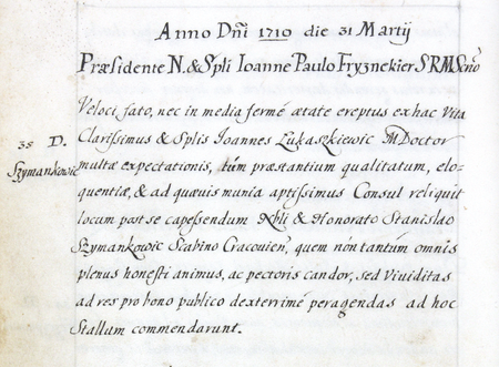Z urzędowego spisu rajców obejmującego lata 1363–1802 fragment strony 42 z wpisem o wyborze do rady miejskiej na miejsce po zmarłym Janie Łukaszkiewiczu (nr 571) nowego rajcy, Stanisława Szymankowica (nr 581), czego dokonano za kadencji burmistrzowskiej Jana Pawła Fryznekiera w 1710 roku – oraz powiększenie zapisu imienia i funkcji burmistrza (Archiwum Państwowe w Krakowie, sygn. rkps 1477, s. 42)