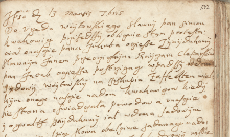 Z księgi protokołów sądu wójtowskiego jurydyki Biskupie obejmującej lata 1615–1629: fragment wpisu z 1625 roku dotyczącego sprawy wytoczonej przez rajcę Szymona Kwakowicza (nr 132) przy udziale rajcy Jana Przeocznickiego, przeciwko Jakubowi Ogiesie (Ociesza), przyszłemu wójtowi biskupskiemu, o gwałt domowy – oraz zbliżenie zapisu imienia i urzędu (Archiwum Narodowe w Krakowie, sygn. Jur. I-20, s. 132)