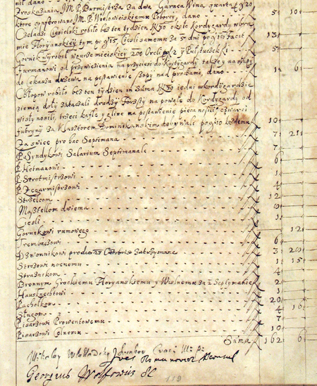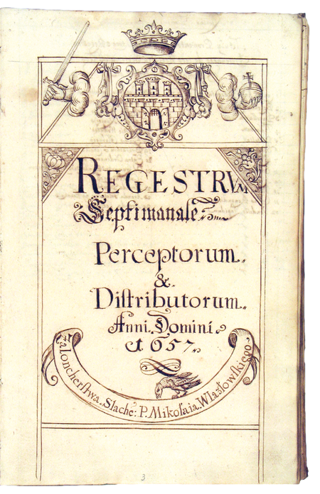 Z księgi miejskiej rachunkowej obejmującej rok 1657 strona tytułowa i fragment strony 52 z okresowym zestawieniem bieżących wydatków ponoszonych przez miasto w 1657 roku – oraz powiększenie złożonego pod tym zestawieniem podpisu Jana Romanowica (Archiwum Państwowe w Krakowie, sygn. rkps 2058, s. 1, 52)