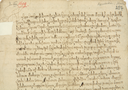 Początkowy fragment kopii układu z 1609 roku między kazimierską radą miejską z burmistrzem Janem Smuszowskim na czele a kazimierską gminą żydowską, dotyczącego przede wszystkim wolnego handlu dla Żydów na terenie chrześcijańskiego Kazimierza i Stradomia – oraz zbliżenie zapisu imienia i funkcji (Archiwum Narodowe w Krakowie, sygn. Jud. Cas. 8, s. 257)