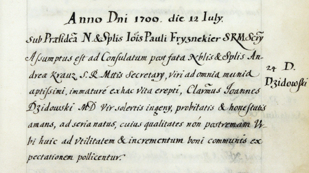 Z urzędowego spisu rajców obejmującego lata 1363–1802 fragment strony 35 z wpisem z 1700 roku o wyborze do rady po śmierci Andrzeja Stanisława Krauza (nr 559) nowego rajcy Jana Stanisława Dzidowskiego, który, jak zapisano: „odznaczał się niezwykłą ostrością umysłu i prawością charakteru, które to cechy zaważyły na jego wyborze” – oraz powiększenie zapisu imienia (Archiwum Państwowe w Krakowie, sygn. rkps 1477, s. 35)