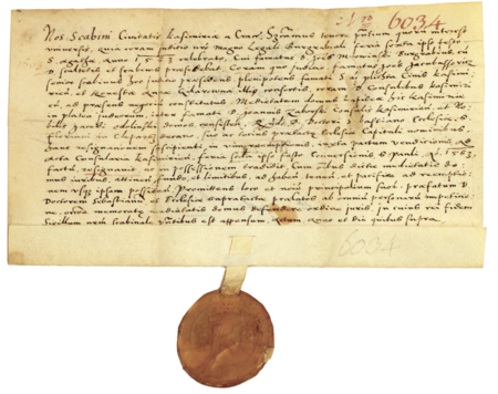 Dokument wydany w 1563 roku w Kazimierzu, mocą którego ławnicy kazimierscy potwierdzili, że Stanisław Plichta z żoną Anną darowali na rzecz kapituły kościoła św. Floriana w Kleparzu dom położony w Kazimierzu, obok domu rajcy Jana Zaborskiego; przy dokumencie na pergaminowych paskach pieczęć ławnicza – oraz zbliżenie pieczęci i zapisu imienia z urzędem (Archiwum Uniwersytetu Jagiellońskiego, sygn. dypl. perg. 532)