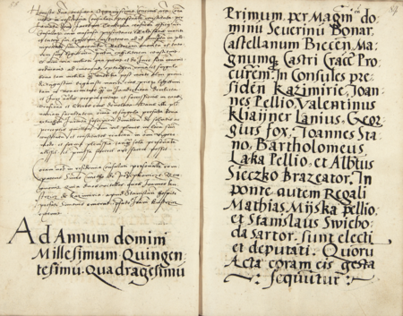 Z księgi radzieckiej Kazimierza obejmującej lata 1540–1545: fragment wpisu dokumentującego wybór rady urzędującej na rok 1541, z Jerzym Foxem w składzie – oraz zbliżenie zapisu imienia (Archiwum Narodowe w Krakowie, sygn. K 10, s. 88–89)