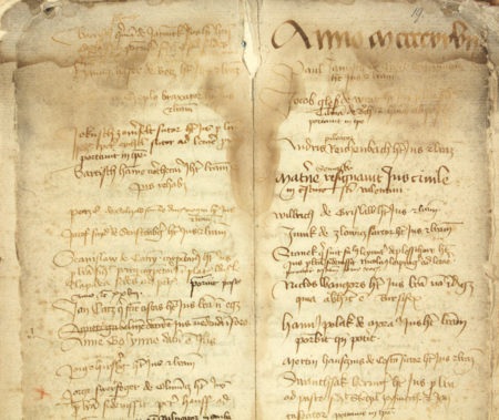 Z księgi przyjęć do prawa miejskiego obejmującej lata 1423−1493 fragment stron 18–19, gdzie znajduje się wpis z 1426 roku, poświadczający przyjęcie do krakowskiego prawa miejskiego Jerzego Hirszberga – oraz powiększenie zapisu imienia (Archiwum Państwowe w Krakowie, sygn. rkps 1421, s. 18−19)