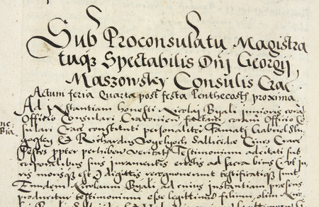 Z księgi radzieckiej obejmującej lata 1575–1580 fragment strony 834 z nagłówkiem otwierającym wpisy spraw prowadzonych za kadencji burmistrzowskiej Jerzego Maszowskiego w 1579 roku – oraz powiększenie zapisu imienia i funkcji burmistrza (Archiwum Państwowe w Krakowie, sygn. rkps 447, s. 834)