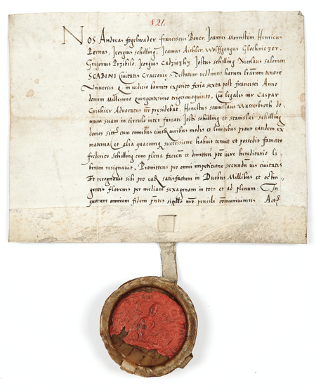 Dokument wydany w 1535 roku w Krakowie, w którym ławnicy miasta Krakowa, wśród nich Jerzy Schilling, poświadczają, że Stanisław Wasserbroth ustąpił Fryderykowi Schillingowi swój dom położony w Rynku pomiędzy domami Jerzego i Stanisława Schillingów za kwotę 2800 florenów – oraz powiększenie zapisu imienia (Biblioteka Czartoryskich w Krakowie, sygn. perg. 821)