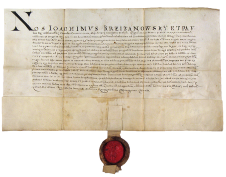 Dokument wydany w 1572 roku w Krakowie, w którym Joachim Krzyżanowski i Paweł Biertułtowski (nr 393), rajcy i lonerzy krakowscy, stwierdzają, że sprzedali Franciszkowi Braciejowskiemu pusty plac na Grzegórzkach, koło ulicy prowadzącej na Błonie, za czynszem 12 groszy rocznie – oraz powiększenie zapisu imienia (Archiwum Państwowe w Krakowie, sygn. perg. 658)