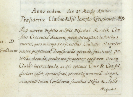 Z urzędowego spisu rajców obejmującego lata 1363–1802 fragment strony 46 z wpisem o wyborze do rady na miejsce po zmarłym Mikołaju Króliku (nr 529) nowego rajcy Ludwika Guilhauma (nr 587), czego dokonano za kadencji burmistrzowskiej Józefa Antoniego Częczkiewicza w 1714 roku – oraz powiększenie zapisu imienia i funkcji burmistrza (Archiwum Państwowe w Krakowie, sygn. rkps 1477, s. 46)