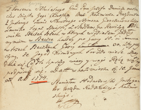 Z księgi miejskiej rachunkowej Kazimierza obejmującej sprawy dóbr miejskich w latach 1609–1789: dokument z 1774 roku będący raportem z lustracji wiśniaku w trzech beczkach, zarządzonej przez burmistrza Józefa Dunicza; stwierdzono zaniżoną ilość napoju z powodu zbyt wielkiej ilości jagód wiśniowych – oraz zbliżenie zapisu imienia i funkcji (Archiwum Narodowe w Krakowie, sygn. K 714, s. 105)